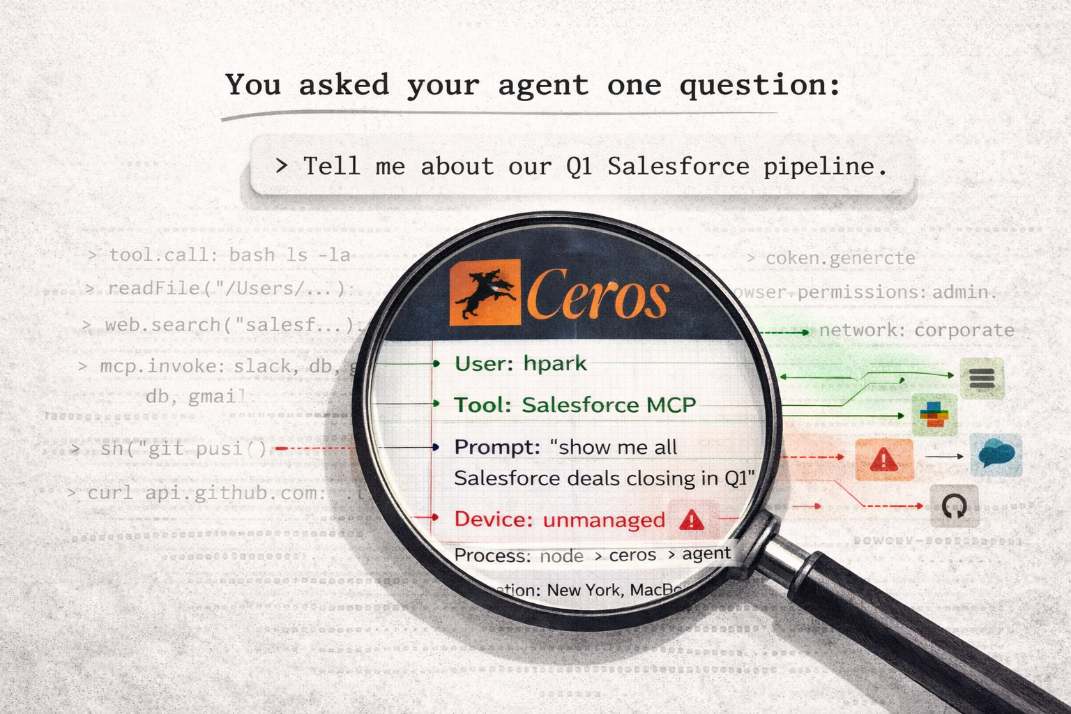 That's it. Two commands. The agent wraps your Claude Code. Your developers don't change their workflow. They run their agents exactly as they did before. The difference is that Ceros now sits alongside the agent on the machine, seeing what it does in real time.